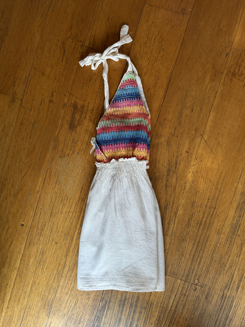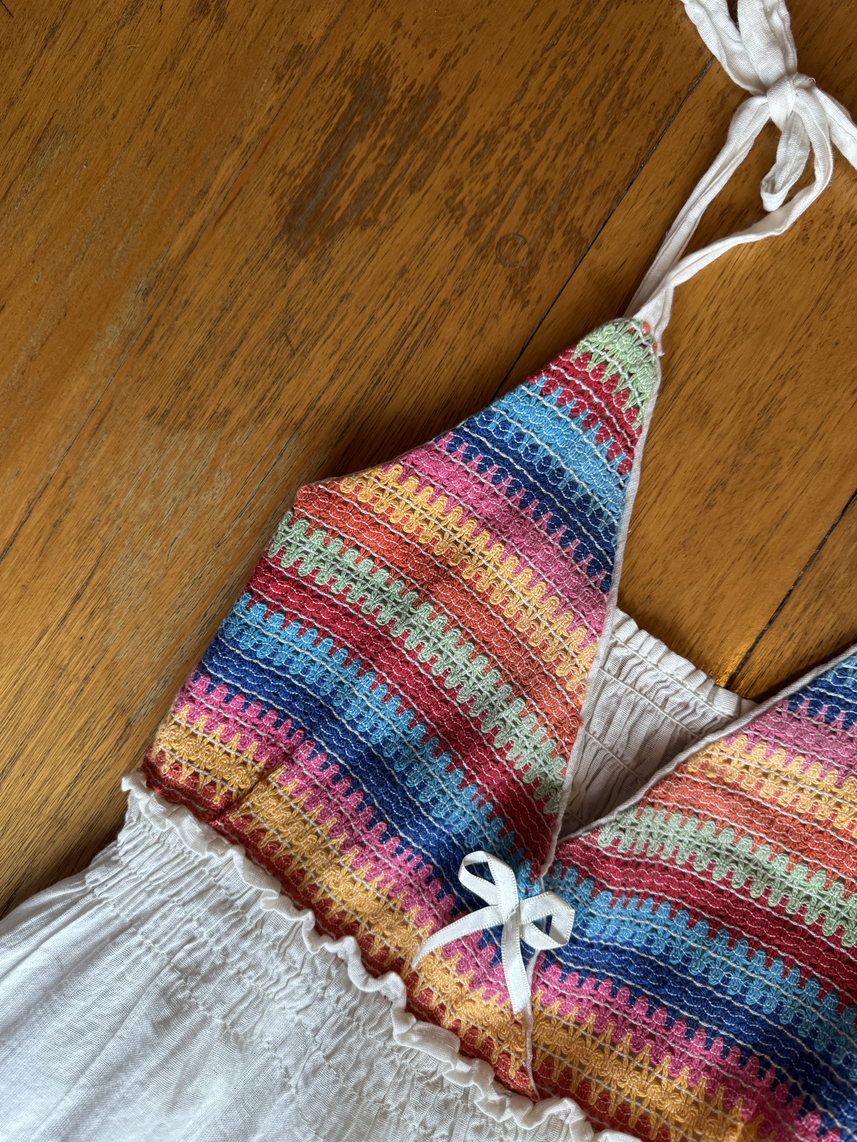 El bordado multicolor en la parte superior aporta un detalle vibrante y femenino que refleja alegría y personalidad. Ideal para combinar con jeans, shorts o faldas, creando un look casual, bohemio o veraniego.
