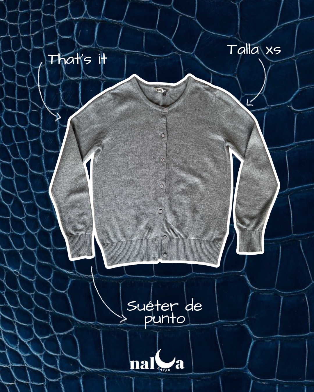 Suéter gris de la marca That’s It, talla XS, con detalles de botones frontales que aportan estilo y versatilidad. Confeccionado en tejido suave y cómodo, ideal para combinar con jeans, faldas o pantalones de vestir. Perfecto para un look casual, elegante o de oficina.